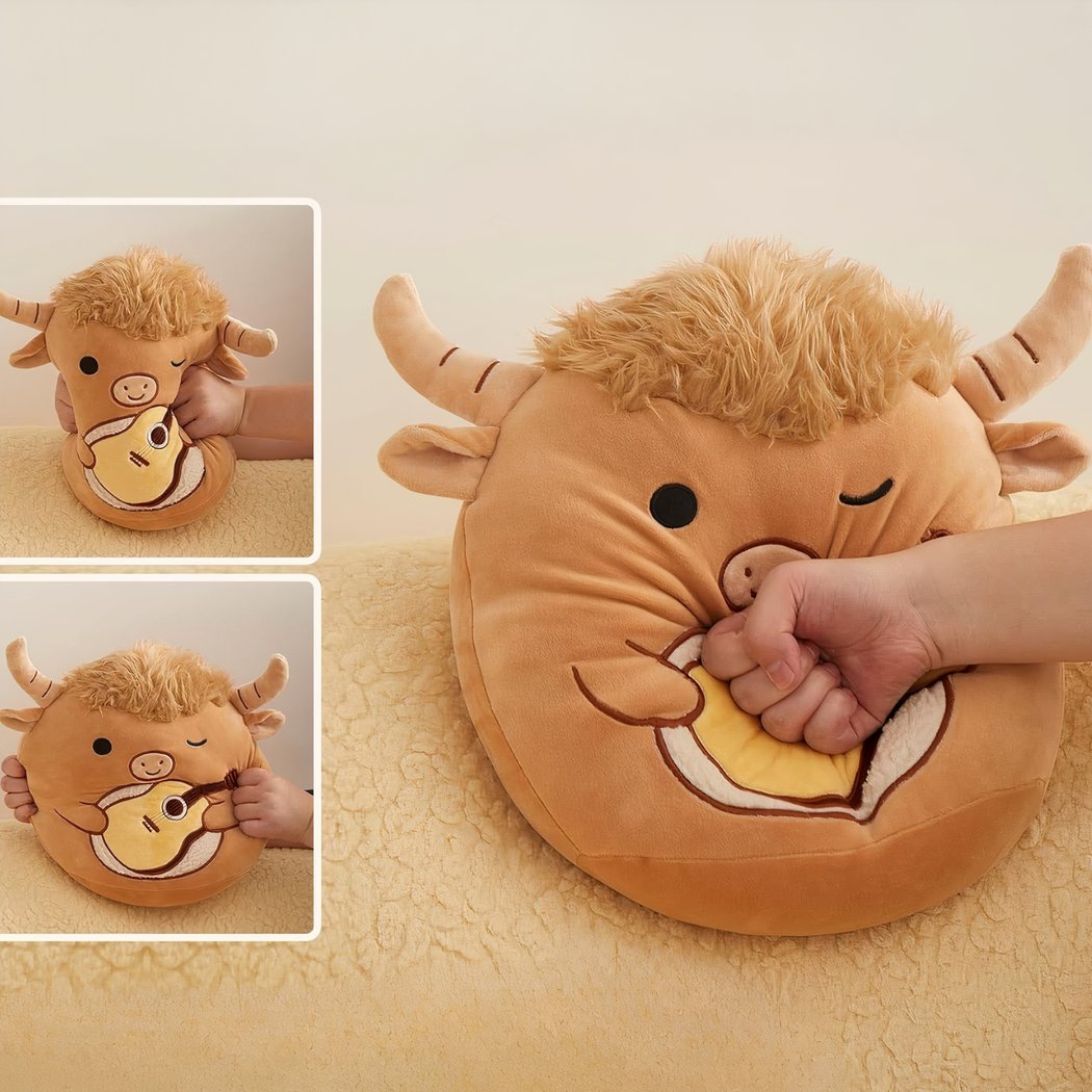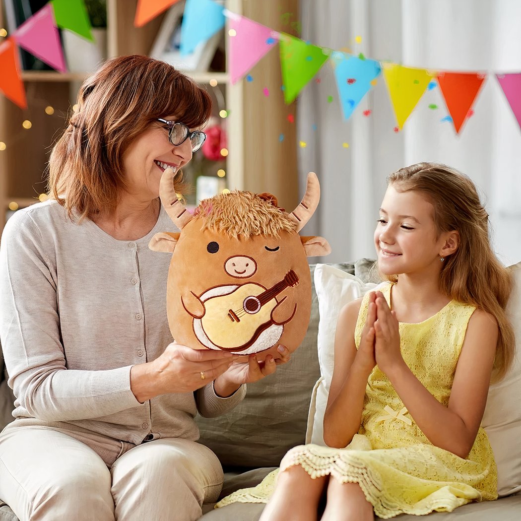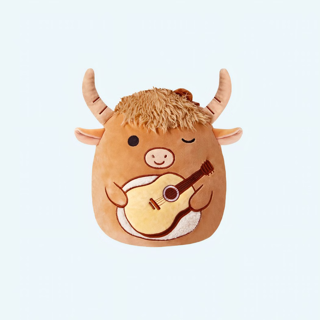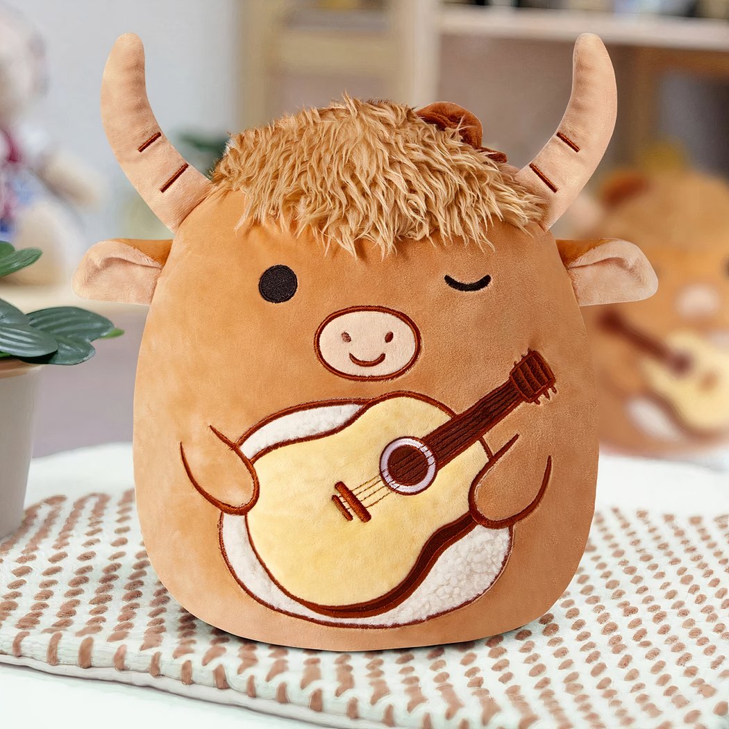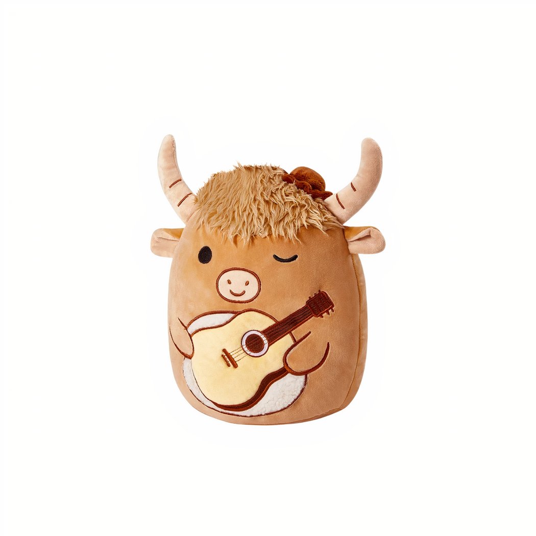 With its fluffy mane and cheerful expression, the Squishmallow bull is sure to catch everyone’s eye. Meticulous details, such as the embroidered guitar and soft horns, add a charming touch.